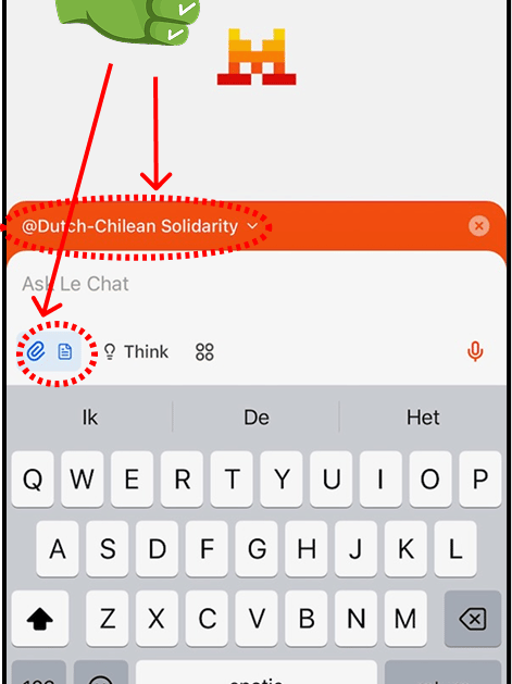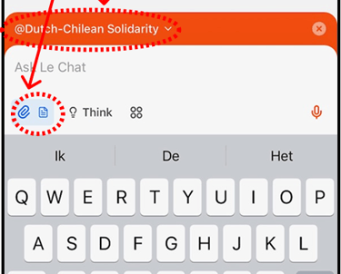Toca de vuelta en la página principal. La ventana de chat debería tener un marco naranja que dice "@Dutch-Chilean Solidarity" y el ícono del clip de abajo debería estar resaltado. ¡Si este es el caso, estás listo para comenzar!