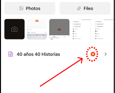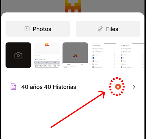De vuelta en la ventana principal, haz clic en el ícono del clip debajo del chat y selecciona el documento "40 años 40 historias"