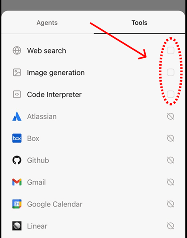 Llegarás a una página donde puedes comenzar a chatear. Antes de empezar a chatear, toca el ícono naranja con 4 cuadrados justo debajo de la ventana de chat. Esto te mostrará 2 pestañas: "Tools" (Herramientas) y "Agents" (Agentes)